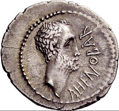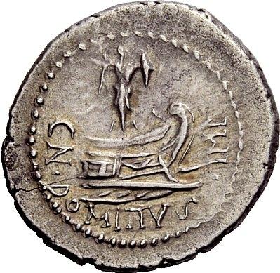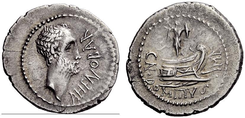 The Roman Republic. Cn. Domitius Ahenobarbus. Denarius, mint moving with Ahenobarbus in 41, AR 4.16g. AHENOBAR Male head r., slightly bearded. Rev. CN DOMITIVS IMP Trophy with two spears and shield standing facing on prow r. Babelon Domitia 21. Sydenham 1177. Sear Imperators 339. Crawford 519/2. Rare. Struck on a large flan, slightly cracked, good very fine. Ex NAC 21, 2001, 318.