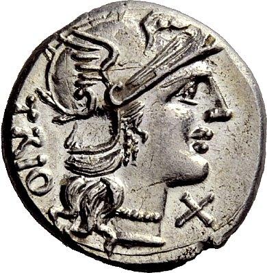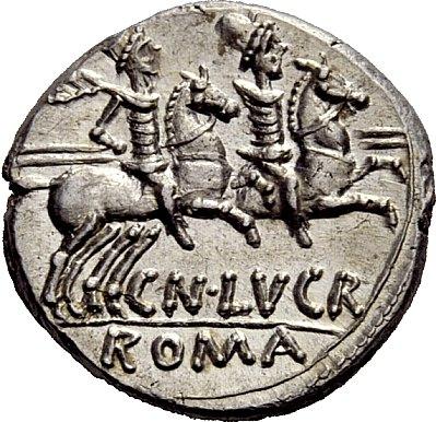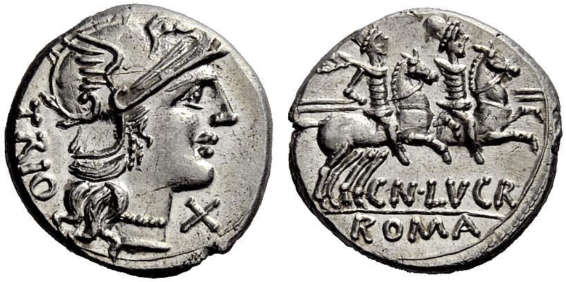 The Roman Republic. Cn. Lucretius Trio. Denarius 136, AR 4.00g. Helmeted head of Roma r.; below chin, X. Behind, TRIO. Rev. Dioscuri galloping r., below, CN·LVCR. In exergue, ROMA. Babelon Lucretia 1. Sydenham 450. Crawford 237/1a. Virtually as struck and Fdc