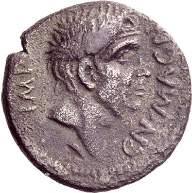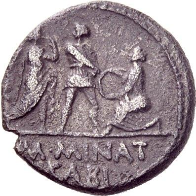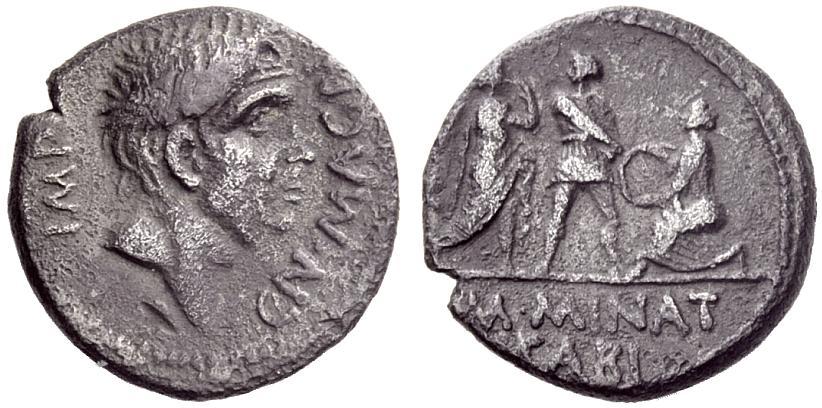The Roman Republic. Cn. Pompeius the Younger with M. Minatius Sabinus. Denarius, Spain 46-45, AR 3.65 g Head of Cn. Pompeius Magnus r. Rev. Pompeian soldier between the personification of two Spanish cities. Babelon Minatia 2 and Pompeia 12. C 9. Sydenham 1037. Crawford 470/1b. T. V. Buttrey, The Denarii of Cn. Pompeius Junior and M. Minatius Sabinus, ANSMN 9, 1960, p. 77, type B and pl. VII, 1 / e. Very rare. Somewhat corroded dark patina, very fine