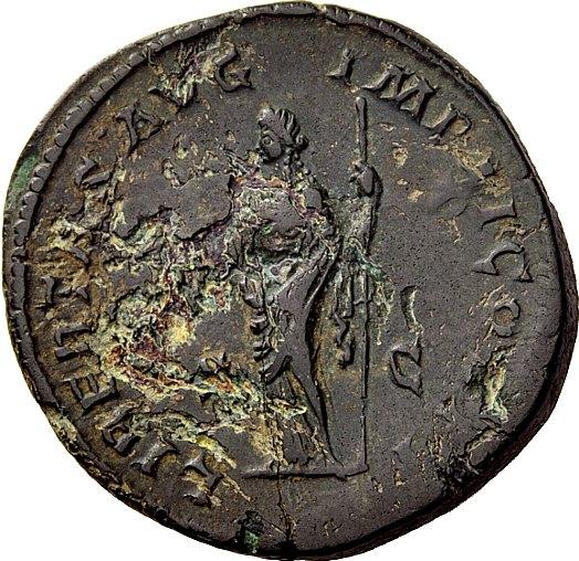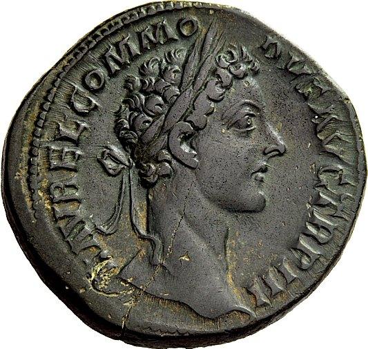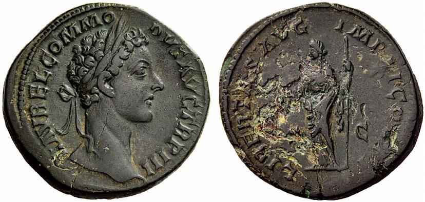 The Roman Republic. Commodus augustus, 177–192. Sestertius 178, Æ 21.92g. Laureate head r. Rev. Libertas standing l., holding pileus and sceptre. C 331. BMC M. Aurelius and Commodus 1684. RIC M. Aurelius 1588. Green patina broken on reverse, otherwise good very fine