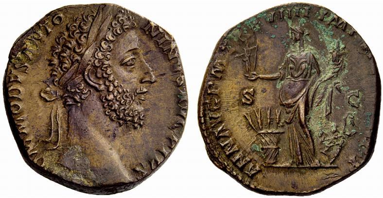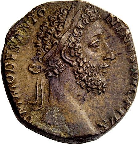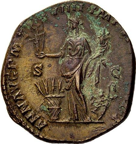 The Roman Republic. Commodus augustus, 177–192. Sestertius 183-184, Æ 17.85g. Laureate head r. Rev. Annona, draped, standing l., holding cornucopia and statuette of Concordia, with patera and sceptre; at feet l., modius with corn ears. Behind, prow of ship with two figures seated in it. C 15. BMC 523. RIC 442. Brown tone with some minor encrustations on reverse, otherwise extremely fine / about extremely fine