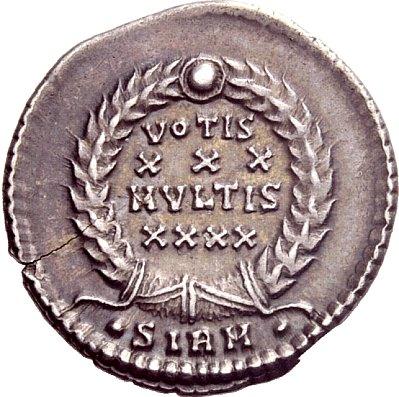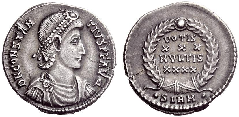 The Roman Republic. Constantius II augustus, 337–361. Siliqua, Sirmium 355-361, AR 3.45g. Pearl-diademed, draped and cuirassed bust r. Rev. Legend within wreath; in exergue, SIRM. C 342. RIC 66 Toned, flan crack at four o’clock, otherwise very fine