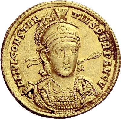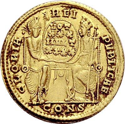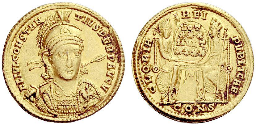 The Roman Republic. Constantius II augustus, 337–361. Solidus, Constantinopolis 351–355, AV 4.35g. Diademed, draped and cuirassed bust facing, holding spear in r. hand and ornamented shield in l. Rev. Roma and Constantinopolis, enthroned facing, supporting a wreath between them; in exergue, CONS. C 112. RIC 96. Depeyrot 3/3. Good very fine