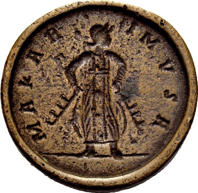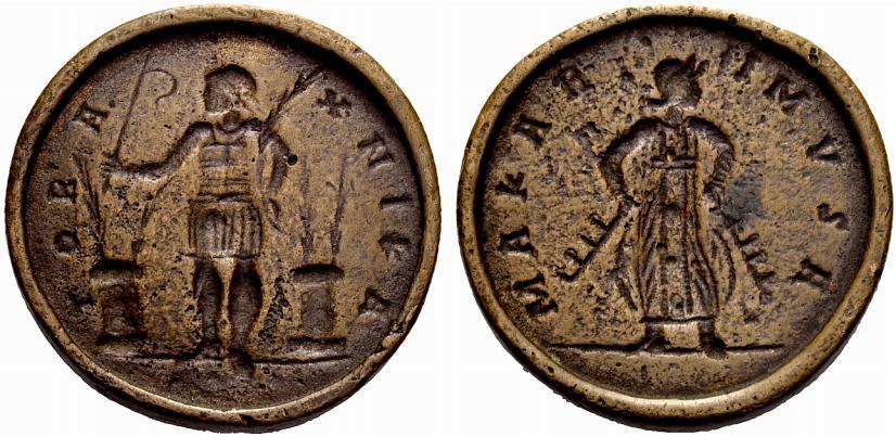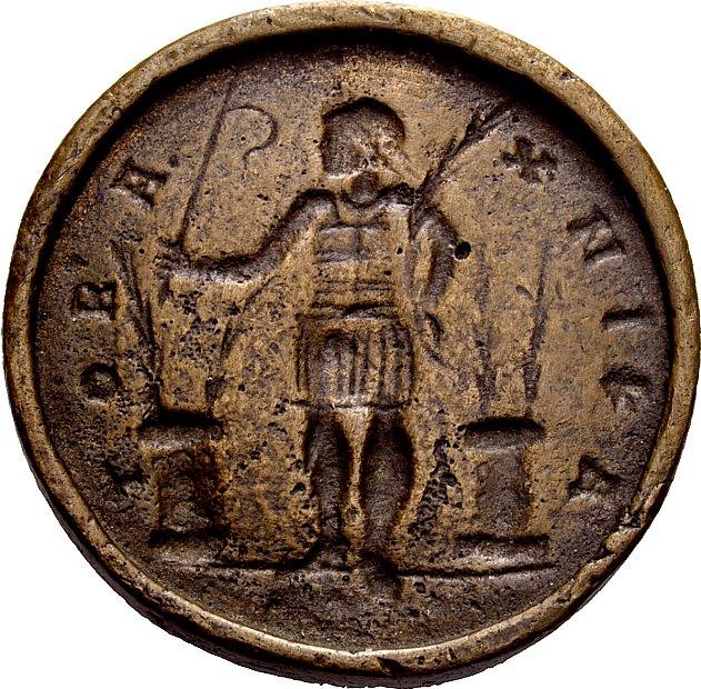 The Roman Republic. Contorniates time of Valentinian the III. Contorniate Æ 24.55g. Charioteer standing facing with head l., holding whip and palm branch; to l. and to r. vase with two palm branches. Rev. Flautist standing facing, head r., holding flute in each hand. Alföldi 654 and pl. 206, 5 (these dies). About very fine
