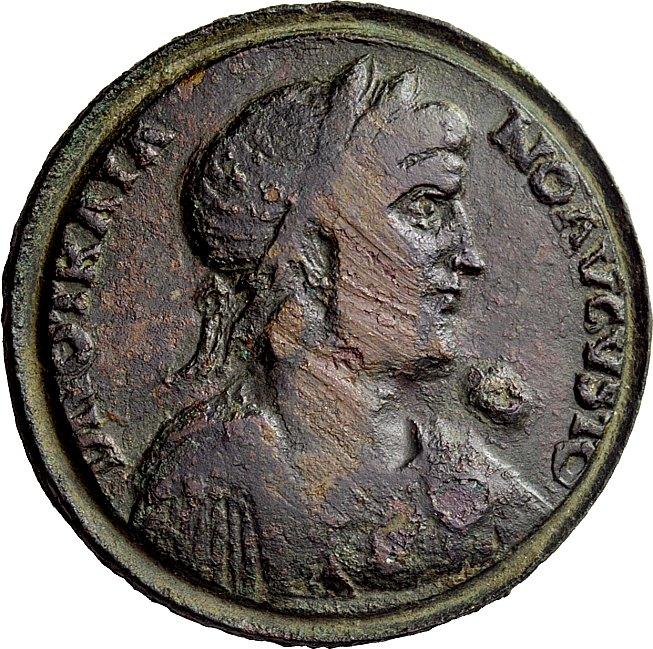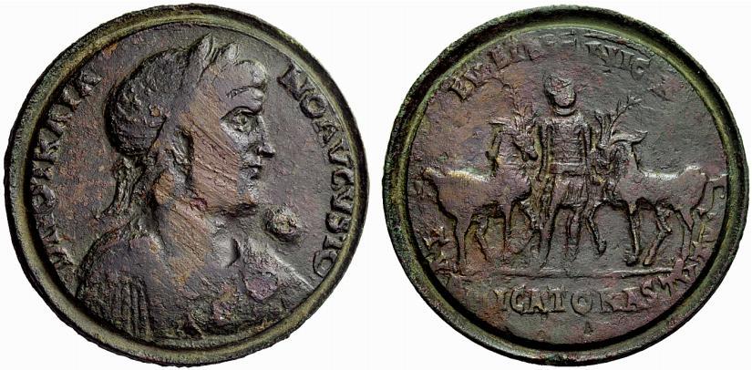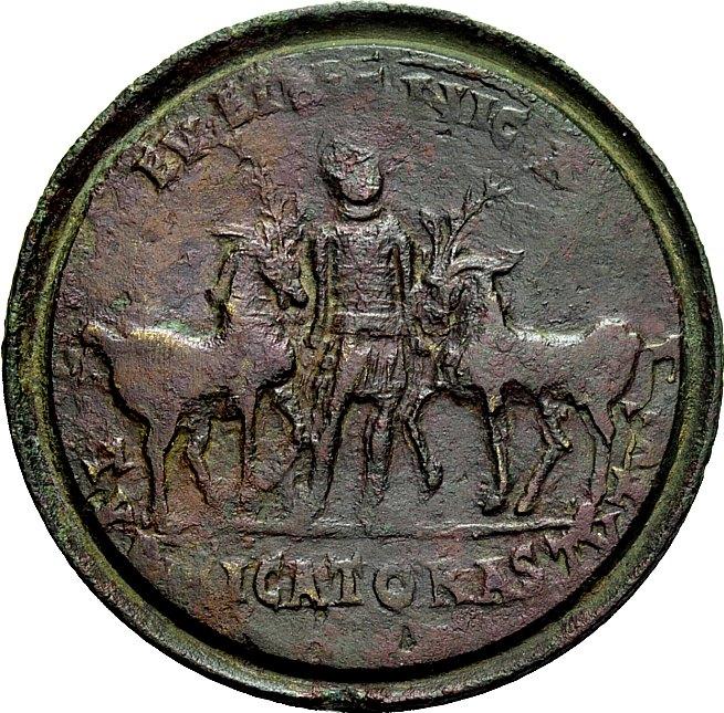 The Roman Republic. Contorniates time of Valentinian the III. Contorniate Æ 30.04g. Laureate, draped and cuirassed bust of Trajan r. Rev. Charioteer holding two palm branches, between two horses. Alföldi 383 and pl. 159, 9 (these dies). Green tone, scuff on cheek, otherwise very fine