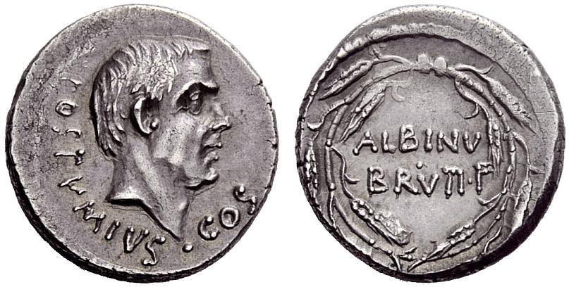The Roman Republic. D. Postumius Albinus. Denarius 48, AR 4.01g. A·POSTVMIVS·COS Head of A. Postumius r. Rev. ALBINV / · / BRVTI·F all within wreath of corn ears. Babelon Postumia 14. Sydenham 943a. Sear Imperators 27. Crawford 450/3b. Lightly toned and extremely fine. Ex NAC sale 25, 2003, 318.