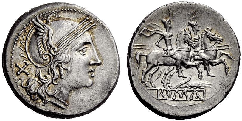 The Roman Republic. Denarius Sicily ca. 211-210, AR 4.52g. Helmeted head of Roma r.; behind, X. Rev. The Dioscuri galloping r.; below, ear of barley. In exergue, ROMA in linear frame. Sydenham 193. Crawford 72/3. Rare. Lightly toned and extremely fine