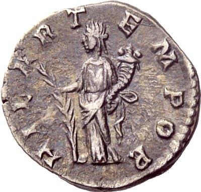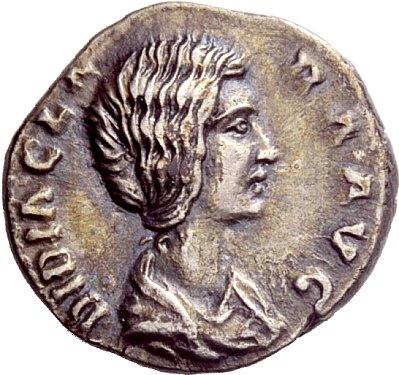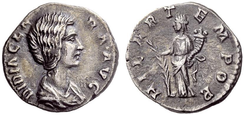 The Roman Republic. Didia Clara, daughter of Didius Julianus. Denarius March 28th-end of May 193, AR 2.77g. Draped bust r. Rev. Hilaritas standing l., holding long palm and cornucopiae. C 3. BMC Didius Julianus 14. RIC Didius Julianus 10. Very rare. Toned, good very fine