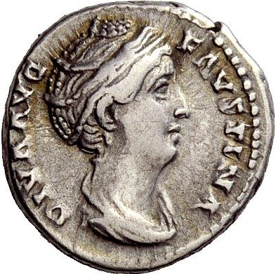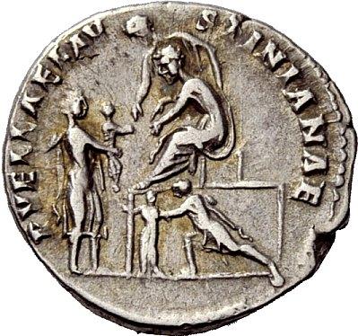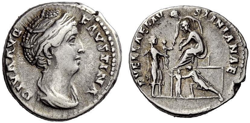 The Roman Republic. Diva Faustina, wife of Antoninus Pius. Denarius after 141, AR 3.33g. Draped bust r., hair coiled on top of head. Rev. PVELLAE-FAVSTINIANAE Antoninus seated l. on platform with a woman standing beside him: both leaning forward to receive a little girl carried by a man standing r. below; in front of the platform another man is running up pushing a second little girl before him. C 262. BMC A. Pius 325. RIC A. Pius 399a. Very rare. Very fine. Ex Aufhaüser sale 12, 1996, 566.