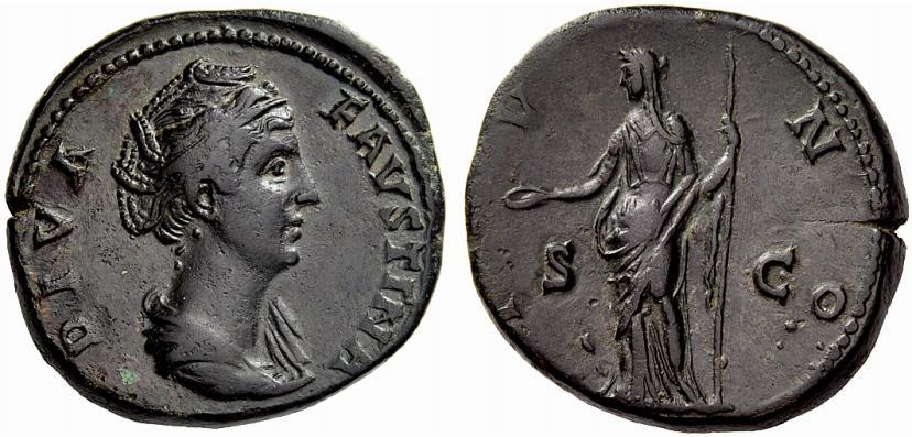 The Roman Republic. Diva Faustina, wife of Antoninus Pius. Sestertius after 141, Æ 29.66g. Draped bust r. Rev. Juno standing l., holding patera and sceptre. C 210. BMC A. Pius 1532. RIC A. Pius 1143. Dark tone and very fine