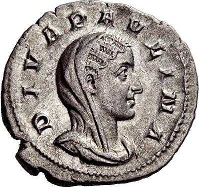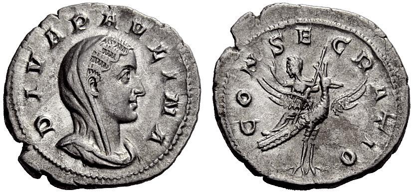 The Roman Republic. Diva Paulina, wife of Maximinus I. Denarius 236, AR 2.56g. Draped and veiled bust r. Rev. Paulina, holding sceptre, seated l. on peacock fliyng r. C 2. BMC Maximinus 127. RIC 2. Very fine