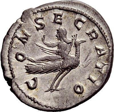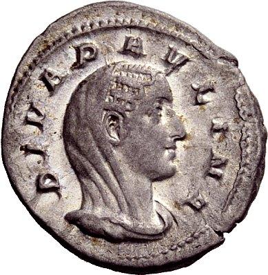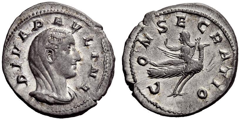 The Roman Republic. Diva Paulina, wife of Maximinus I. Denarius 236, AR 3.28g. Draped and veiled bust r. Rev. Paulina, holding sceptre, seated l. on peacock flying r. C 2. BMC Maximinus 127. RIC 2. Good very fine