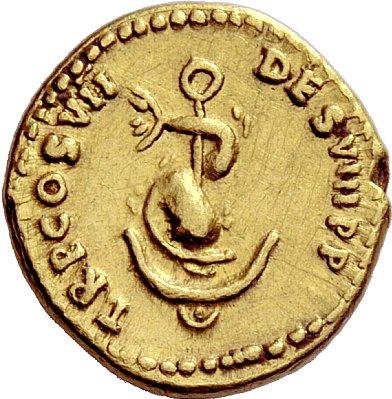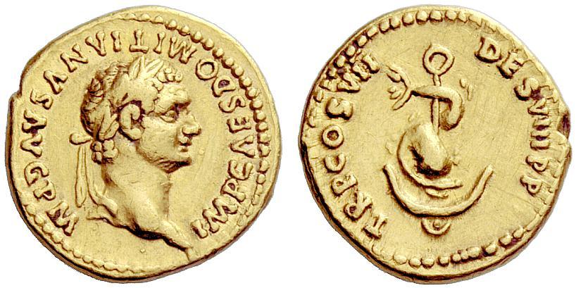 The Roman Republic. Domitian augustus, 81–96. Aureus 81, AV 7.29g. Laureate head r. Rev. Dolphin coiled around anchor. C 567. BMC 20 note. RIC 53. Calicó 123. Good very fine Ex Rauch sale 83, 2008, 218.