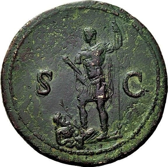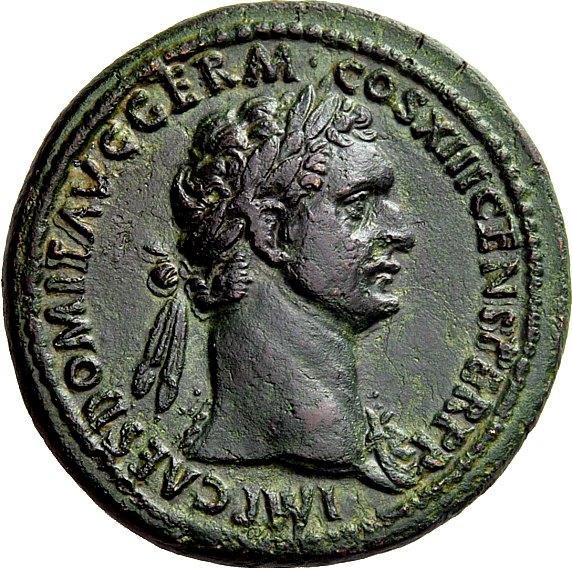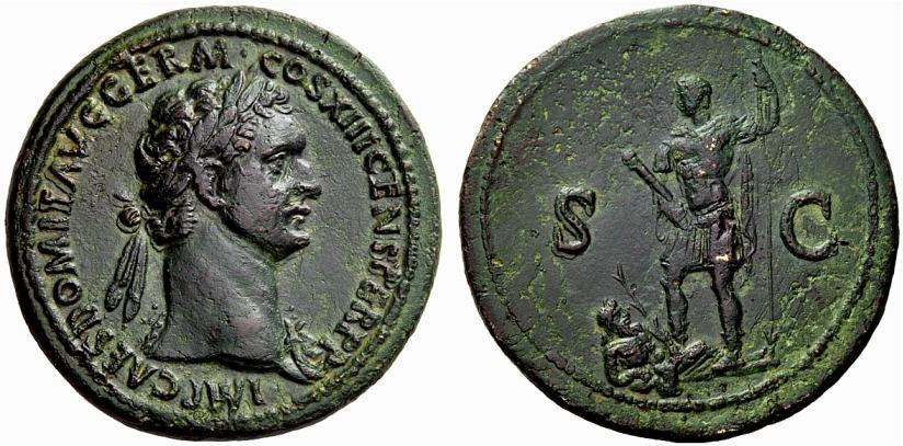 The Roman Republic. Domitian augustus, 81–96. Sestertius 87, Æ 21.57g. Laureate bust r. wearing aegis. Rev. Domitian standing l. holding parazonium and spear; to l. river-god (Rhenus) reclining. C 506. BMC 596. RIC 528. Mazzini 506 (this coin). Green patina and very fine. Ex Naville II, 1922, Vautier and Collignon, 561; Glendining 1952, Ryan part IV, 2410 sales. From the Mazzini collection.