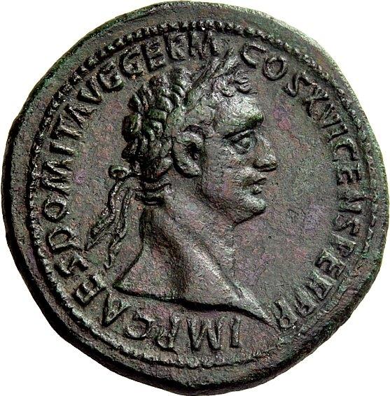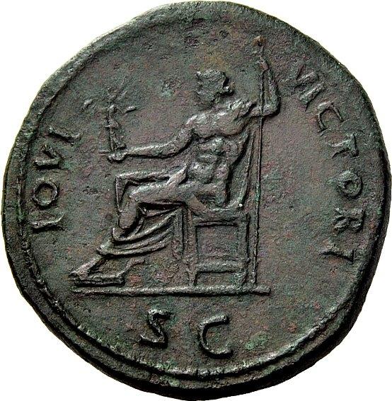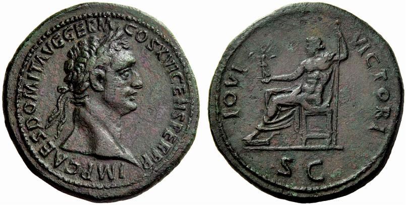 The Roman Republic. Domitian augustus, 81–96. Sestertius 92-94, Æ 26.48g. Laureate head r. Rev. Jupiter seated l. on throne holding Victory and sceptre. C 315. BMC 464. RIC 751. Green patina somewhat smoothed, otherwise very fine