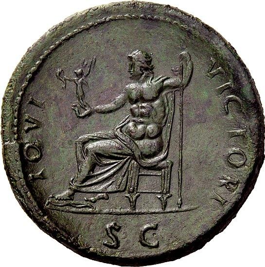 The Roman Republic. Domitian augustus, 81–96. Sestertius 92-94, Æ 26.69g. Laureate head r. Rev. Jupiter seated l. on throne holding Victory and sceptre. C 315. BMC 464. RIC 751. Lovely green patina, good very fine