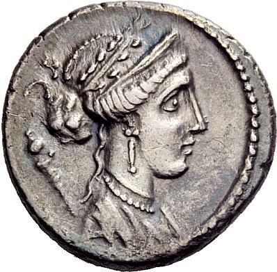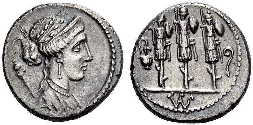 The Roman Republic. Faustus Cornelius Sulla. Denarius 56, AR 4.26g. Laureate, diademed and draped bust of Venus r.; behind, sceptre. Above, S·C. Rev. Three trophies; on either side, jug and lituus. In exergue, monogram of FAVSTVS (Faustus Cornelius Sulla). Babelon Cornelia 63. Sydenham 884. Crawford 426/3. Toned and about extremely fine
