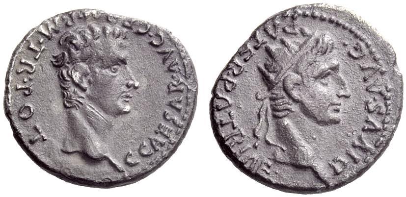 The Roman Republic. Gaius, 37–41. Denarius 37-38, AR 3.33g. Bare head of Gaius r. Rev. Radiate head of Augustus r. C 2. BMC 17. RIC 16. CBN 21. Rare. Old cabinet tone with some oxidations, otherwise good very fine