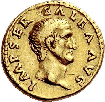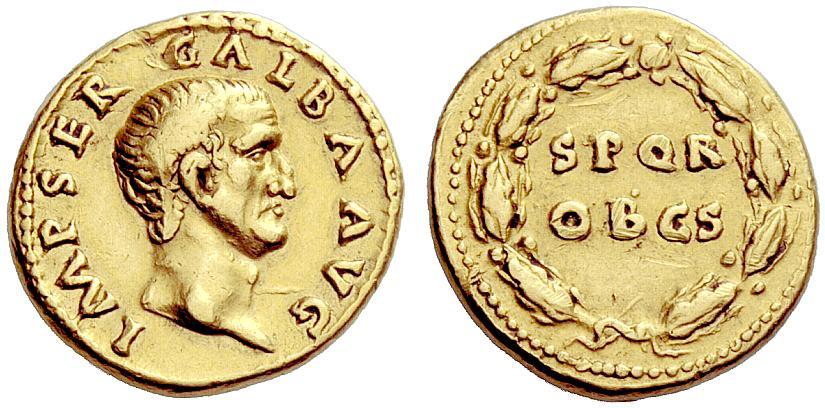 The Roman Republic. Galba, 68–69. Aureus July 68-January 69, AV 7.23g. Bare head r. Rev. Legend within wreath. C286. BMC 29. RIC 264. Calicó 509. Rare. A bold portrait, area of weakness on obverse and light scratches on reverse, otherwise about extremely fine / good very fine