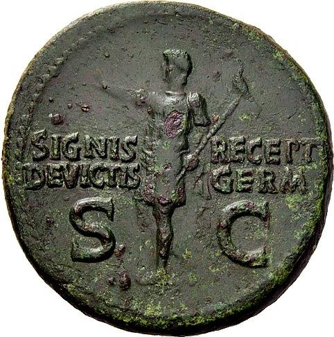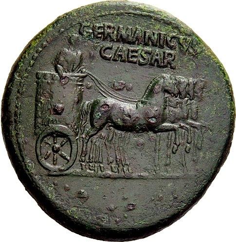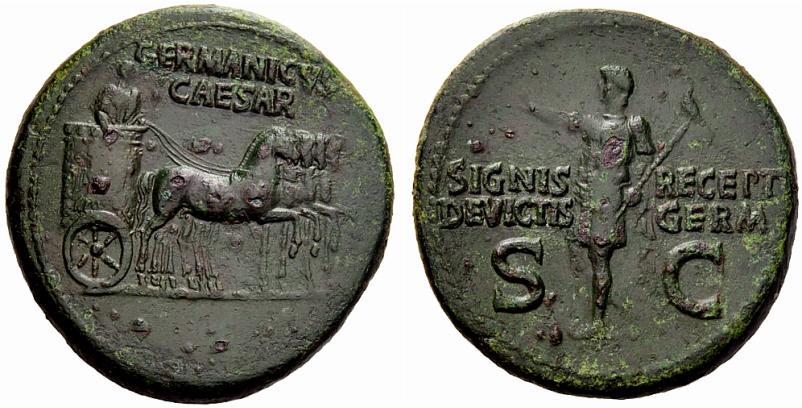 The Roman Republic. In the name of Germanicus, father of Gaius. Dupondius 37-41, Æ 16.26g. Germanicus, bare-headed and cloaked, standing in ornamented slow quadriga r., holding eagle-tipped sceptre. Rev. Germanicus, bare-headed and cuirassed, standing l., holding eagle- tipped sceptre in l. hand and raising r. C 7. BMC Gaius 93. RIC Gaius 57. CBN Gaius 140. Green patina with some encrustations, otherwise good very fine / very fine