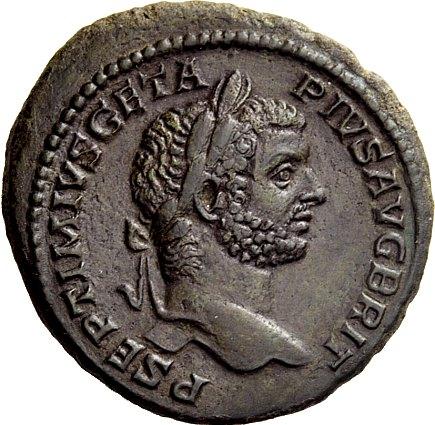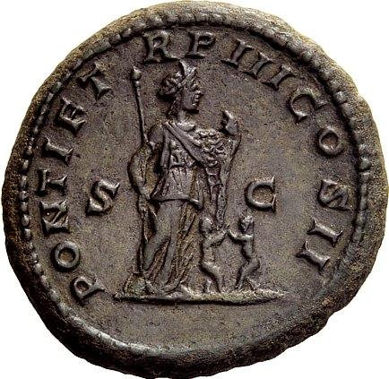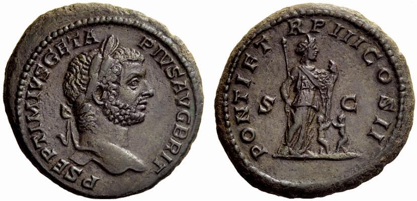 The Roman Republic. Geta augustus, 209–211. As 210, Æ 11.58g. Laureate head r. Rev. Female figure standing r., holding sceptre and drawing out drapery from breast; at feet to r., two small figures lifting hands to one other. C 152. BMC 227. RIC 177a. Green patina, about extremely fine