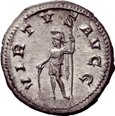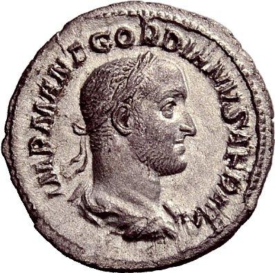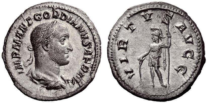The Roman Republic. Gordian I, 1st-22nd April 238. Denarius April 238, AR 2.12 g Laureate, draped and cuirassed bust r. Rev. Virtus in military attire, holding sceptre and shield set on ground. C 14. BMC 30. RIC 3. Surrface somewhat porous, otherwise almost extremely fine