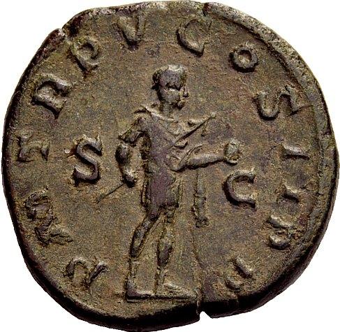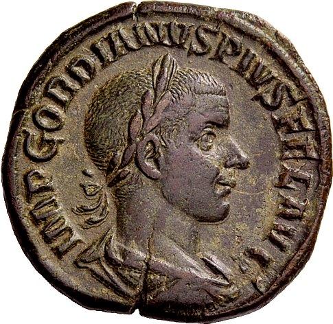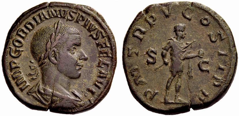 The Roman Republic. Gordian III augustus, 238–244. Sestertius 241-243, Æ 20.80g. Laureate, draped and cuirassed bust r. Rev. Gordian in military attire standing r., holding spear and globe. C 267. RIC 307a. Green patina and very fine