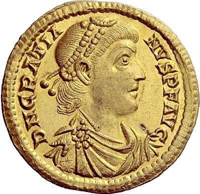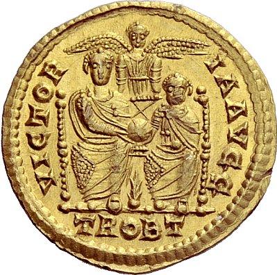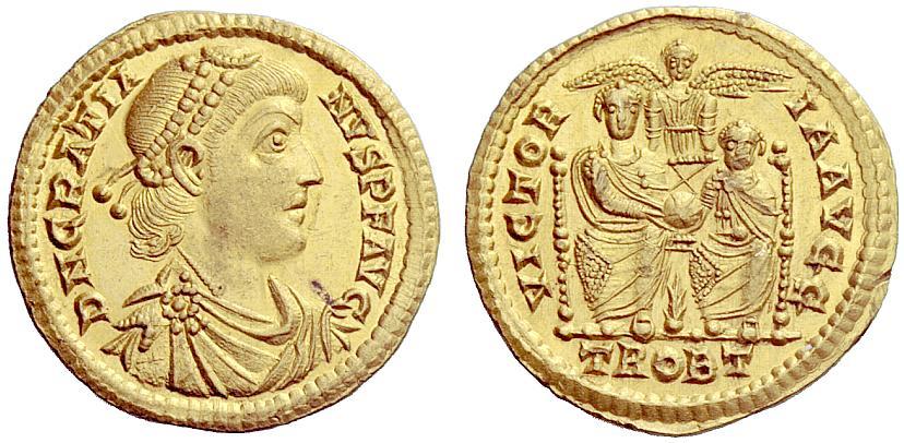 The Roman Republic. Gratian, 367–383. Solidus, Trier 378-383, AV 4.47g. Pearl-diademed, draped and cuirassed bust r. Rev. Two emperors seated facing holding globe, the one on the r. smaller; above, Victory with spread wings between them, below a palm-branch. In exergue, TROBT. C 39. RIC 49b. Extremely fine