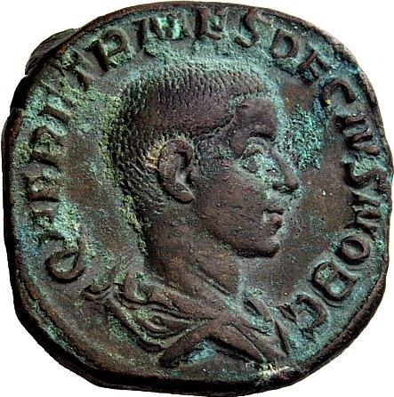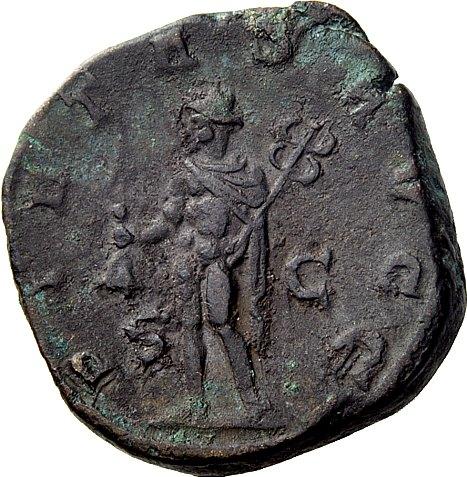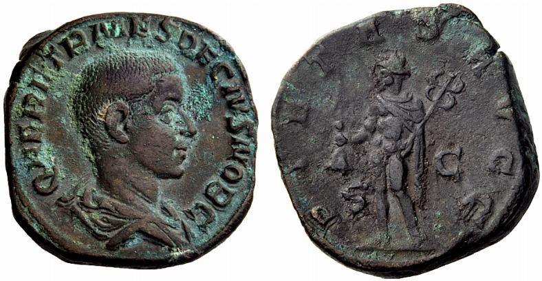 The Roman Republic. Herennius Etruscus, caesar, 250–251. Sestertius 250-251, Æ 21.12g. Bare-headed, draped and cuirassed bust r. Rev. Mercury standing l., holding purse and caduceus. C 12. RIC 167a. Dark green tone and good very fine