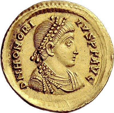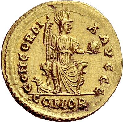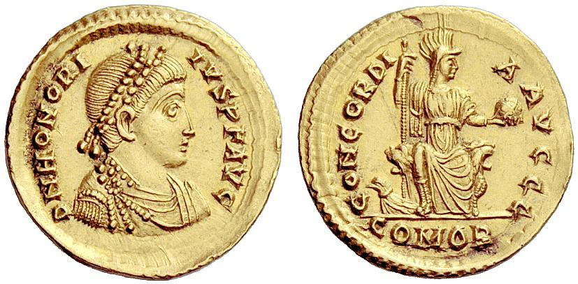 The Roman Republic. Honorius, 393–423. Solidus, Thessalonica 393-395, AV 4.40g. Pearl-diademed, draped and cuirassed bust r. Rev. Constantinopolis, helmeted, seated facing, head r., on throne of lions, holding sceptre and globe; r. foot on prow. In exergue, COMOB. C 7 . RIC 64g. Depeyrot 43/1. Very rare. Extremely fine