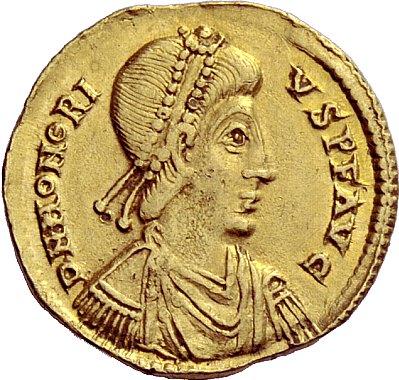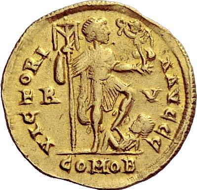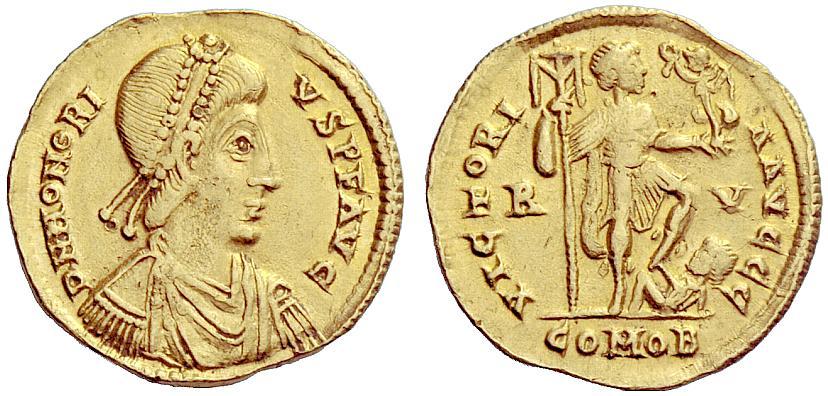 The Roman Republic. Honorius, 393–423. Solidus, Ravenna after 408, AV 4.44g. Pearl-diademed, draped and cuirassed bust r. Rev. Emperor standing r., holding standard and Victory on globe, spurning captive with his l. foot; in field, R–V and in exergue, COMOB. C 44. RIC 1326. Depeyrot 7/1. Ranieri cfr 11. Good very fine. Ex NAC sale 46, 2008, 1176.