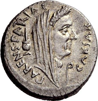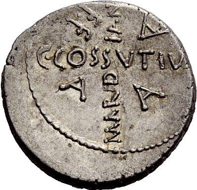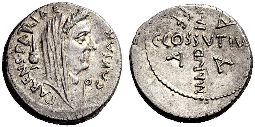 The Roman Republic, Julius Caesar and C. Cossutius Maridianus. Denarius 44, AR 4.10 g. CAESAR – PARENS·PATRIAE Veiled and wreathed head of Caesar r.; behind, apex and before, lituus. Rev. C·COSSVTIVS and MARIDIANVS arranged in form of cross; in angles, A – A – A – F – F. B. Julia 43 and Cossutia 2. C 18. Sydenham 1069. Sear Imperators 112. Crawford 480/19 note. Reverse slightly off-centre, otherwise good extremely fine