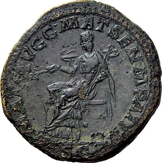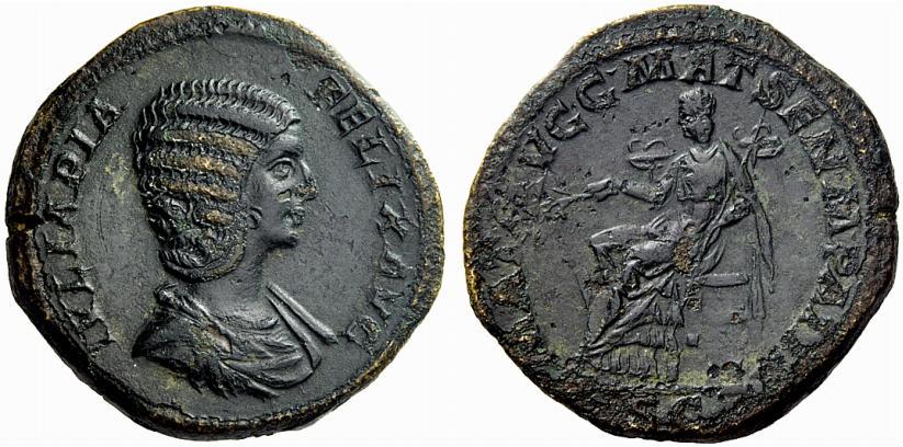 The Roman Republic. Julia Domna, wife of Septimius Severus. Sestertius 212-217, Æ 24.86g. Draped bust r. Rev. Julian Domna seated l. on throne, holding branch and sceptre. C 112. BMC Caracalla 213. RIC Caracalla 588. Dark green patina, good very fine