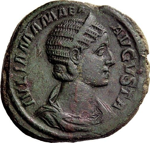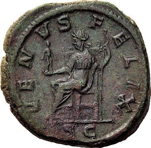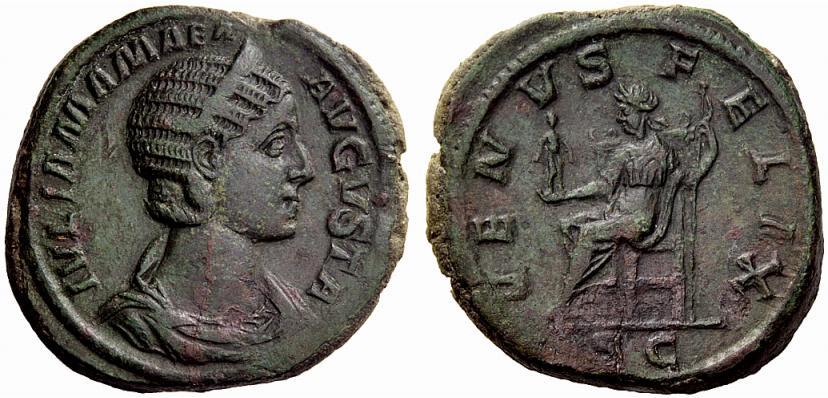 The Roman Republic. Julia Mamea, mother of Severus Alexander. Sestertius 224, Æ 24.94g. Diademed and draped bust r. Rev. Venus seated l., holding in r. hand naked Cupid and sceptre in l. C 69. BMC S. Alexander 197. RIC S. Alexander 701. Light green patina, very fine