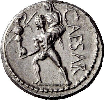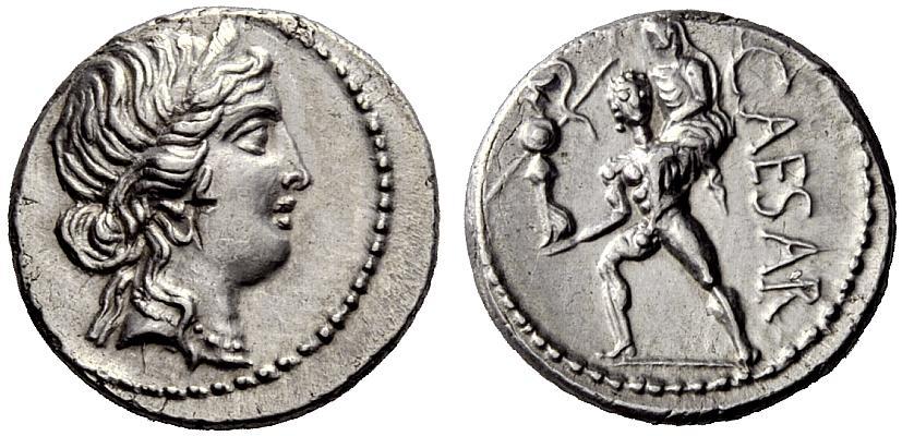 The Roman Republic, Julius Caesar. Denarius, Africa 47-46, AR 3.89 g. Diademed head of Venus r. Rev. CAESAR Aeneas advancing l., carrying palladium in r. hand and Anchises on l. shoulder. Babelon Julia 10. C 12. Sydenham 1013. Sear Imperators 55. Crawford 458/1. Countermark on cheek and an almost invisible scuff at one o’clock on obverse, otherwise extremely fine