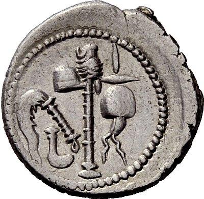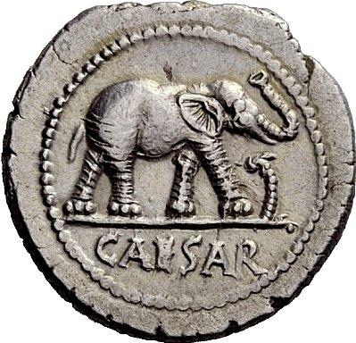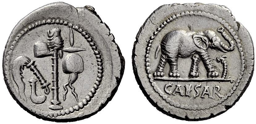 The Roman Republic. Julius Caesar. Denarius, mint moving with Caesar 49-48. AR 4.20g. Pontifical emblems: culullus, aspergillum, axe and apex. Rev. Elephant r., trampling dragon; in exergue, CAESAR. Babelon Julia 9. Sydenham 1006. C. 9. Sear Imperators 9. Crawford 443/1. Struck on a very broad flan and about extremely fine