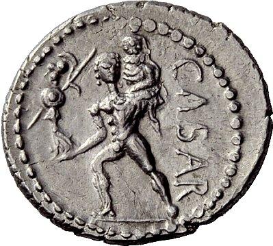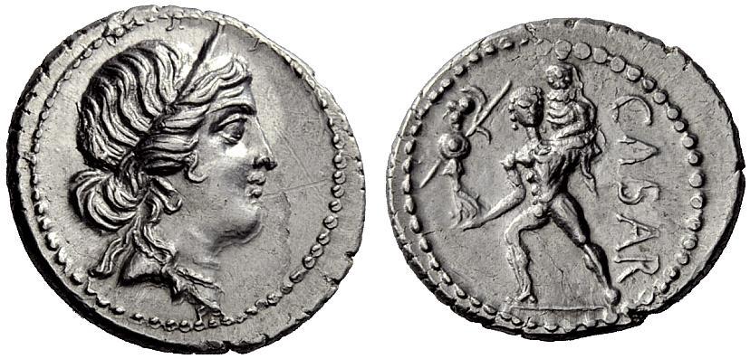The Roman Republic. Julius Caesar. Denarius, Africa 47-46, AR 3.77g. Diademed head of Venus r. Rev. Aeneas advancing l., carrying palladium in r. hand and Anchises on l. shoulder. Babelon Julia 10. C 12. Sydenham 1013. Sear Imperators 55. Crawford 458/1. A graffito on obverse field, otherwise about extremely fine / extremely fine