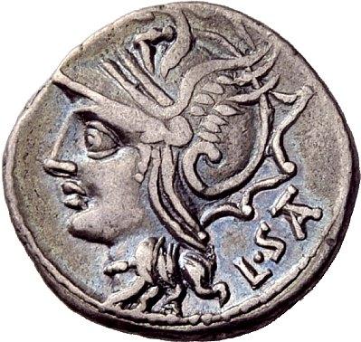 The Roman Republic. L. Appuleius Saturninus. Denarius 104, AR 3.96g. Helmeted head of Roma l.; behind, E. Rev. Helmeted head of Roma l.; behind, L SAT. Babelon Appuleia 2. Sydenham 579. Crawford 317/1. Rare and in unusually good condition for the issue. Lovely tone and good very fine / about extremely fine