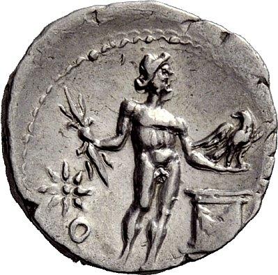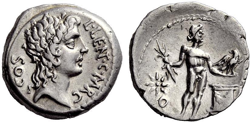 The Roman Republic, L. Cornelius Lentulus and C. Claudius Marcellus. Denarius, Apollonia and Asia 49, AR 4.08 g. L·LENT ·C·MARC Head of Apollo r. Rev. Jupiter standing facing, head r., holding thunderbolt and eagle; in l. field, star and Q. In r. field, garlanded altar. Babelon Cornelia 65 and Claudia 10. Sydenham, 1030. Sear Imperators 5. Crawford 445/2. About extremely fine