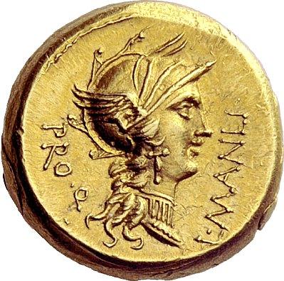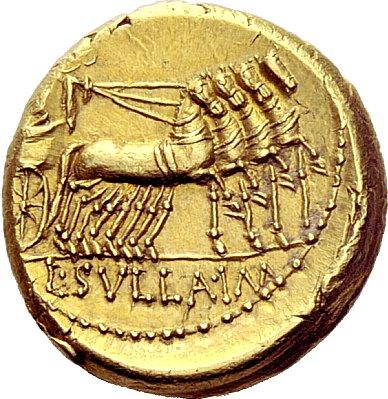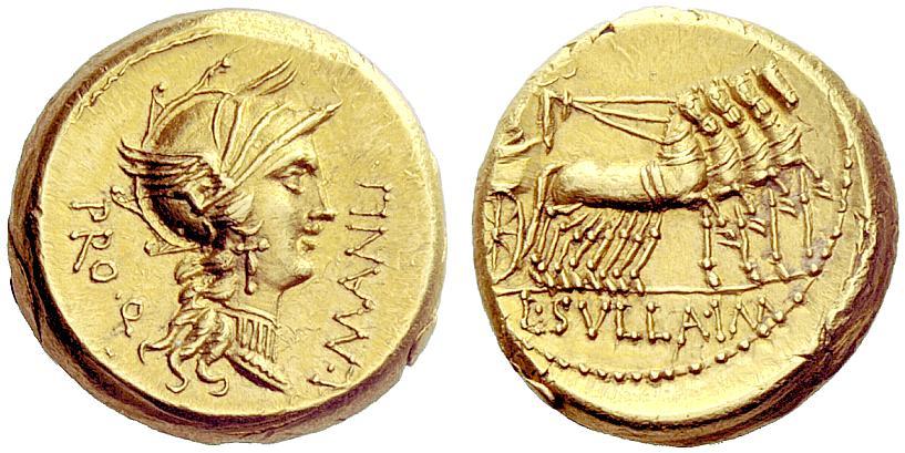 The Roman Republic. L. Cornelius Sulla Imperator with L. Manlius Torquatus Proquaestor. Aureus, mint moving with Sulla 82, AV 10.84g. L·MANLI–PRO·Q. Helmeted head of Roma r. Rev. Triumphator, crowned by flying Victory in quadriga r., holding reins and caduceus; in exergue, L·SVLLA·IM. Bahrfeldt 13 and pl. 3, 8 (this obverse die). Kent-Hirmer pl. 15, 50. Babelon Cornelia 38, Manlia 3. Sydenham 756. Crawford 367/4. Calicó 16. Very rare and in exceptional condition for the issue. Reverse slightly off-centre, otherwise virtually as struck and almost Fdc. Ex NAC sale 11, 1998, 229. In the Roman Republic gold coinage was struck only on rare occasions. It was introduced during the Second Punic War, when Rome and her Italian allies struggled to defeat the Carthaginian invader Hannibal, and it was not struck again for nearly 125 years. This next occasion was a crisis that equally tested the Romans, for they suffered an uprising of their Italian allies in 91 B.C., and for the first time Roman armies invaded the capital. The circumstances behind these terrible events had long been forming. For centuries Rome had relentlessly subdued its neighbours, and in the process it had constructed a system of alliances which allowed her to collect taxes and levy troops every year. It was a double-edged sword for the allies–while it was better to join Rome than to oppose her, Rome could only remain powerful because it used their young men for their conquests. There were several levels of alliance membership, and neighbouring cities within the same regions often had a very different status. The ultimate prize for Rome’s Italian federates was obtaining Roman citizenship, and in 91 B.C. that cause was taken up by the tribune Livius Drusus. But, his swift and brutal murder dashed all hope, and a rebellion erupted throughout Italy. Leading the way were the Samnites, a fierce people living in the hills and mountains near Rome. After suffering initial defeats, Rome was able in 90 and 89 to satisfy most of its former allies with promises of Roman citizenship (which, remarkably, remained unfulfilled until the census of 70). Though Rome pacified most of its opponents, the Samnites continued to resist, and in 88 they even appealed to king Mithradates VI of Pontus for help. Mithradates sent financial aid and, in the meantime, he caused the murder of 80,000 Romans and Italians living in Asia before ravaging Roman territories in Asia Minor and Greece. These two crises–the resistance of the Samnites and the aggressions of Mithradates–set the stage for a conflict between the Roman warlords Sulla and Marius. Through many tribulations, Sulla overcame all of his opponents, in part by unleashing Rome’s own armies against the capital, something which had never before occurred. Sulla was able to impose what later Roman historians called the Regnum Sullanum, a dictatorial era during which he executed his enemies with appalling cruelty. However, he eventually restored the senate’s power, and in 79 retired to Campania shortly before he died. This rare aureus celebrates the triumphs Sulla was awarded for his defeat of Mithradates, and of the Samnites at the Battle of the Colline Gate in 82. On the reverse a triumphal quadriga bears the figure of Sulla, who is crowned by a Victory flying above. The inscription L SVLLA IM makes it clear that Sulla is the figure in the quadriga. This aspect should not be overlooked, for it is an early example of a Roman coin depicting a living person–something that would eventually become a defining feature of coins of the Imperatorial period. In this aureus we have a precursor to the royal portraiture initiated by Julius Caesar nearly four decades later. Also, since this coin was issued either contemporarily or soon after Sulla’s triumphal procession through the streets of Rome, it serves as a document of that great event.