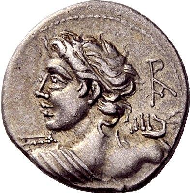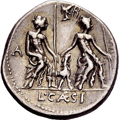 The Roman Republic. L. Caesius. Denarius 112 or 111, AR 3.90g. Bust of Apollo l. seen from behind, holding thunderbolt; behind, RA ligate. Rev. Lares Praestites seated facing, each holding staff in l. hand; between them, dog and above, bust of Vulcan with tongues over shoulder; at sides, LA ligate–[ER] ligate. In exergue, L CAESI. Babelon Caesia 1. Sydenham 564. Crawford 298/1. Toned and about extremely fine