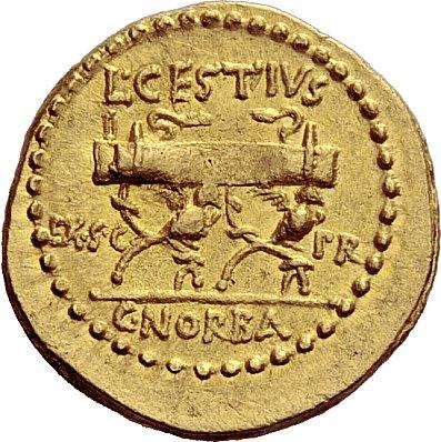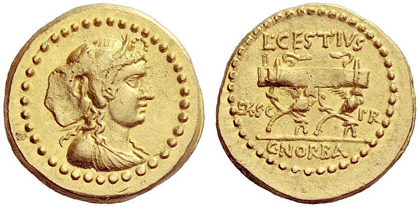 The Roman Republic. L. Cestius and C. Norbanus. Aureus January-April 43, AV 8.11.g. Draped bust of Africa r., wearing elephant skin headdress. Rev. L·CESTIVS / EX·S·C–P R Curule chair with legs decorated with eagles above which two snakes facing each other; in exergue, C·NORBA. Bahrfeldt 25 and pl. IV, 19 (these dies). Babelon Cestia 2 and Norbana 4. Sydenham 1154. Sear Imperators 195a. Crawford 491/1b. Calicó 4. An extremely rare variety. Struck on a very broad flan. Minor area weakness on reverse, otherwise good extremely fine. Ex Triton I, 1997, 1249 and NAC 45, Barry Feirstein Collection IV, 2008, 29 sales.