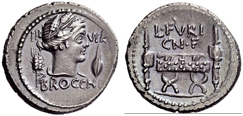The Roman Republic. L. Furius Cn. f. Brocchus. Denarius 63, AR 3.87g. IIIāVIR Head of Ceres r.; at sides, corn-ear and barley- grain. Below, BROCCHI. Rev. L·FVRI· / CN·F Curule chair; on either side, fasces. Babelon Furia 23. Sydenham 902. Crawford 414/1. Attractively toned, two insignificant nicks on obverse, otherwise extremely fine