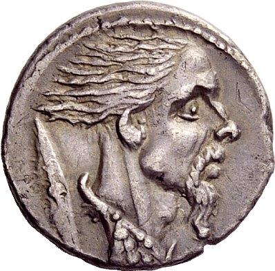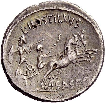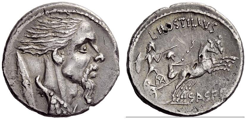 The Roman Republic. L. Hostilius Saserna. Denarius 48, AR 3.79g. Bearded male head r.; behind, Gallic shield. Rev. [L·HOSTILIVS] Naked Gallic warrior in fast biga driven r. by charioteer, holding whip; below horses, SASERN. Babelon Hostilia 2. Sydenham 952. Sear Imperators 18. Crawford 448/2a. Old cabinet tone, several countermarks on reverse field, otherwise about extremely fine / good very fine