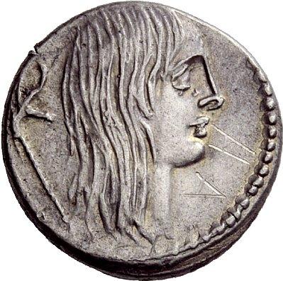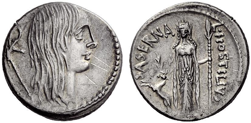 The Roman Republic. L. Hostilius Saserna. Denarius 48, AR 3.81g. Female head r. with long hair; behind, carnyx. Rev. Artemis standing facing, holding spear and placing r. hand on head of prancing stag. Babelon Hostilia 4. Sydenham 953. Sear Imperators 19. Crawford 448/3. Graffito on obverse field, otherwise about extremely fine
