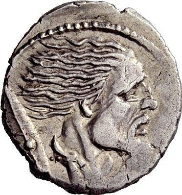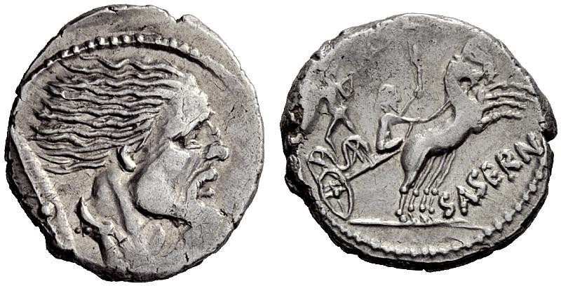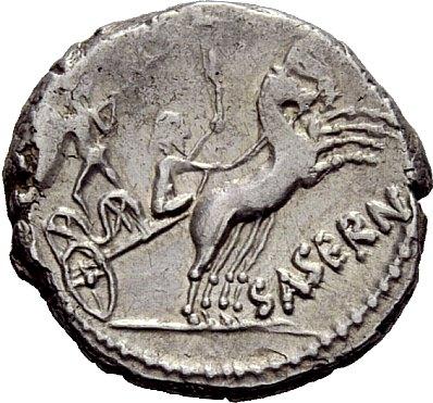 The Roman Republic. L. Hostilius Saserna. Denarius 48, AR 3.93g. Bearded male head r.; behind, Gallic shield. Rev. Naked Gallic warrior in fast biga driven r. by charioteer, holding whip. Babelon Hostilia 2. Sydenham 952. Sear Imperators 18. Crawford 448/2a. Minor area of weakness, otherwise about extremely fine