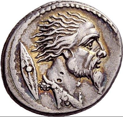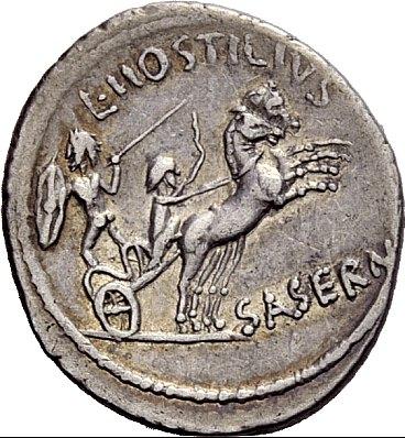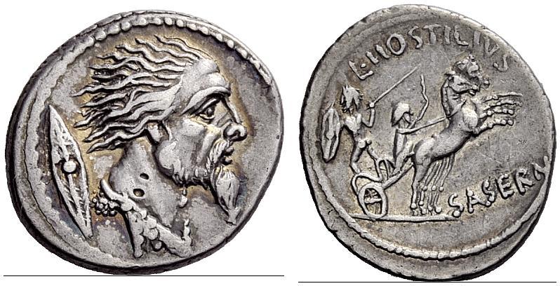 The Roman Republic. L. Hostilius Saserna. Denarius 48, AR 3.94g. Bearded male head r.; behind, Gallic shield. Rev. L·HOSTILIVS Naked Gallic warrior in fast biga driven r. by charioteer, holding whip; below horses, SASERN. Babelon Hostilia 2. Sydenham 952. Sear Imperators 18. Crawford 448/2a. Struck on an unusually broad flan and complete. Lovely tone, two minor counter marks on neck, otherwise good very fine / about extremely fine