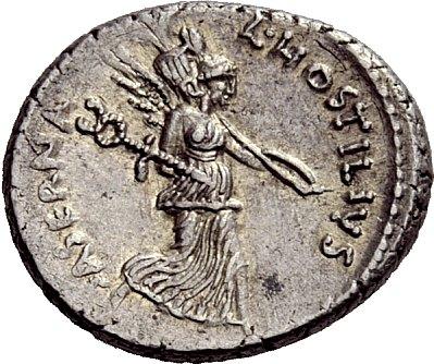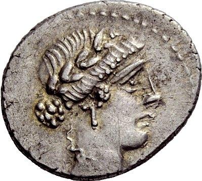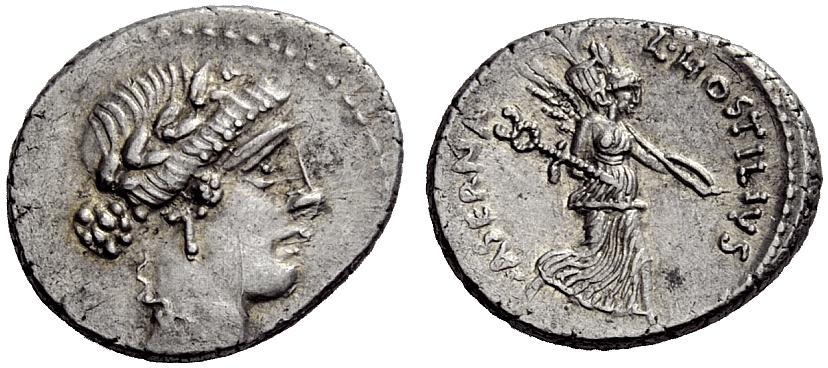 The Roman Republic. L. Hostilius Saserna. Denarius 48, AR 3.98g. Female head r., wearing oak-wreath. Rev. Victory advancing r., holding caduceus and palm branch. Babelon Hostilia 5. Sydenham 951. Crawford 448/1a. Minor scratches on cheek, otherwise about extremely fine