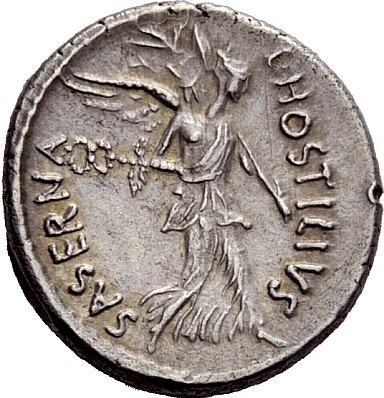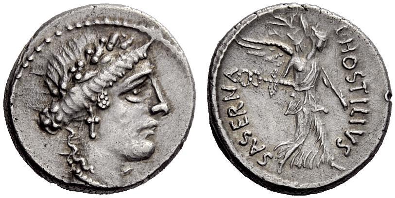 The Roman Republic. L. Hostilius Saserna. Denarius 48, AR 4.02g. Female head r., wearing oak wreath. Rev. L·HOSTILIVS SASERNA Victory advancing r., holding caduceus and palm branch. Babelon Hostilia 5. Sydenham 951. Sear Imperators 17. Crawford 448/1a. Lightly toned and extremely fine. Ex NAC sale 27, 2004, 267.