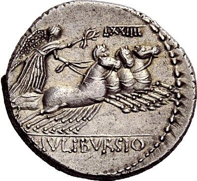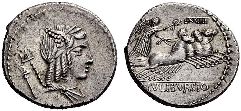 The Roman Republic. L. Julius Bursio. Denarius 85, AR 3.94g. Male head r., with the attributes of Apollo, Mercury and Neptune; behind, torch. Rev. Victory in quadriga r., holding reins in l. hand and wreath in r.; above, IXXIIII and, in exergue, L·IVLI BVRSIO. Babelon Julia 5. Sydenham 728. Crawford 352/1a. Lightly toned and extremely fine. Ex NAC sale N, 2003, 1527.
